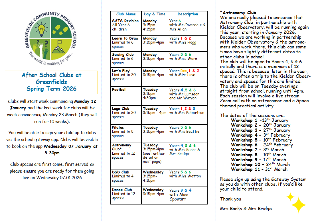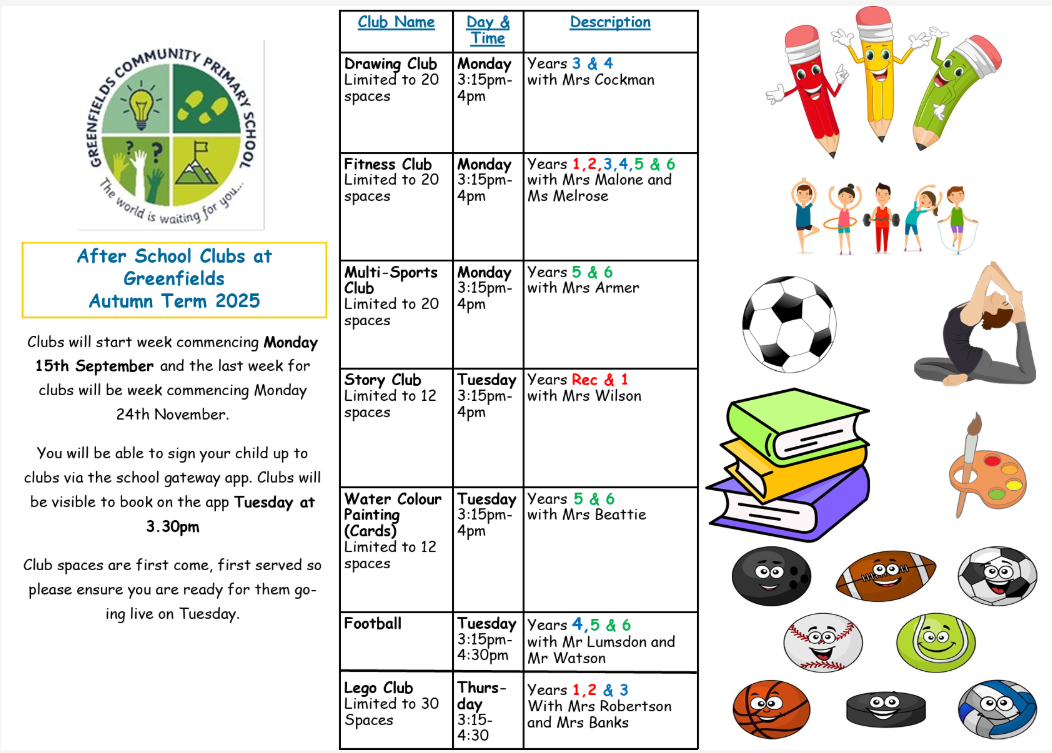 Our clubs are very popular and are often full. We send our offering out each term and bookings can be made on the School Gateway App: https://login.schoolgateway.com/0/auth/login