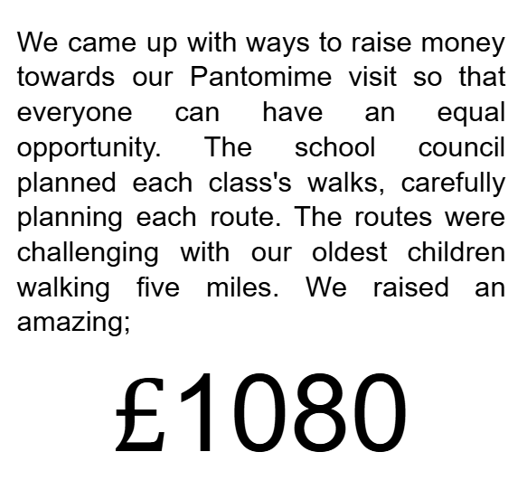 At this meeting, the school council also thought hard about fundraising for the Theatre Royal pantomime trip at the end of November. They decided that each class would take part in a sponsored walk. The funds raised went straight towards the cost of transport to and from the Theatre.