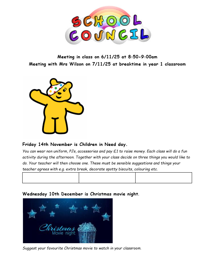 At the start of November, the school council met to discuss Children in Need and our upcoming Christmas movie night. They discussed options with their classes, before meeting as a council to put forward each year groups ideas:
