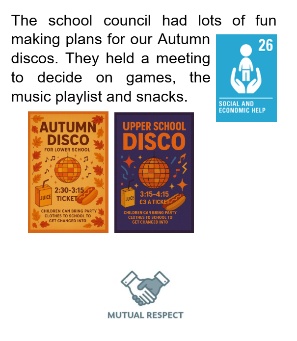 In October, the school council discussed how to plan and improve our school discos. They asked their classmates for their views before the meeting to make sure everyone's voice was heard. The school council then pulled everyone's ideas together to decide on the games, playlist and snacks and worked together to create posters for the lower and upper school disco.